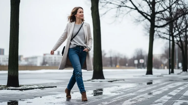 This outfit pairs a soft cream sweater with a light beige coat for a gentle winter palette. The blue jeans keep it classic and the tan suede boots tie everything together. The textures feel warm and inviting with a look that works for both casual walks and relaxed travel days. It is simple and timeless with pieces that feel easy to style.