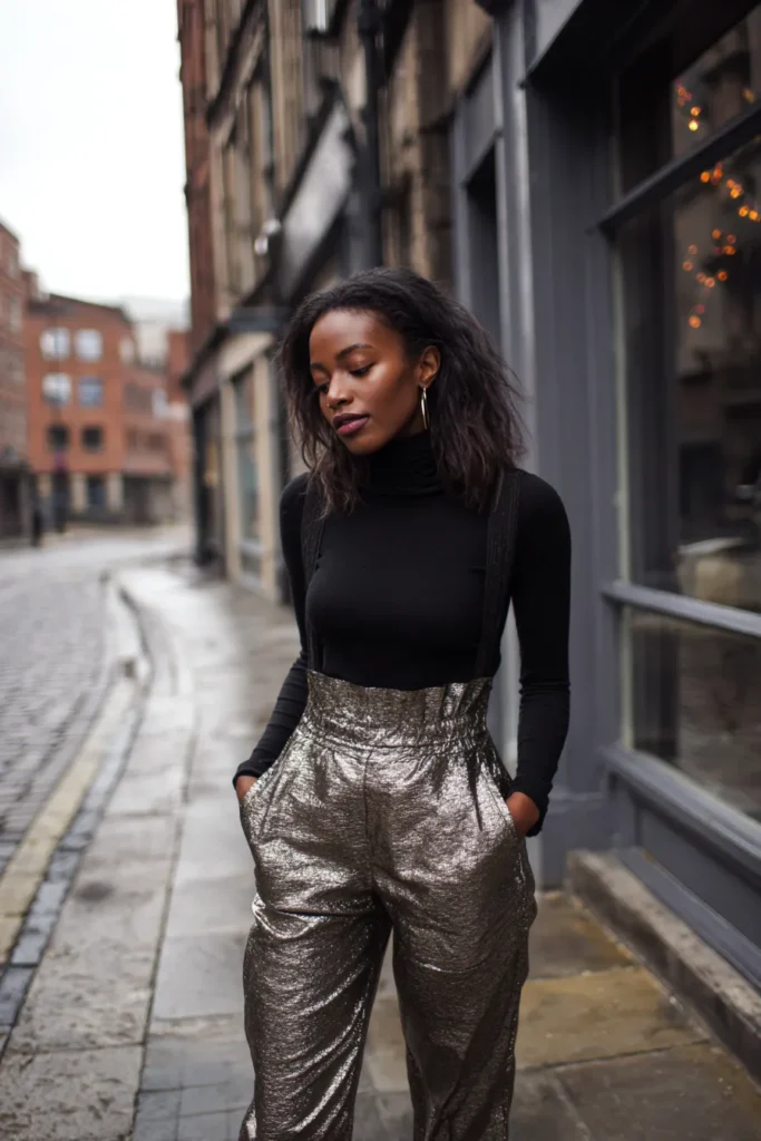 This outfit pairs a fitted black turtleneck with high rise metallic trousers that catch the light with every step. The trousers have a liquid silver shine that feels modern and luxe while the subtle texture keeps them interesting. The black top balances the bold pants and keeps the look polished. Gold hoop earrings add a soft contrast to the cool toned metallics and the whole look feels effortlessly chic.