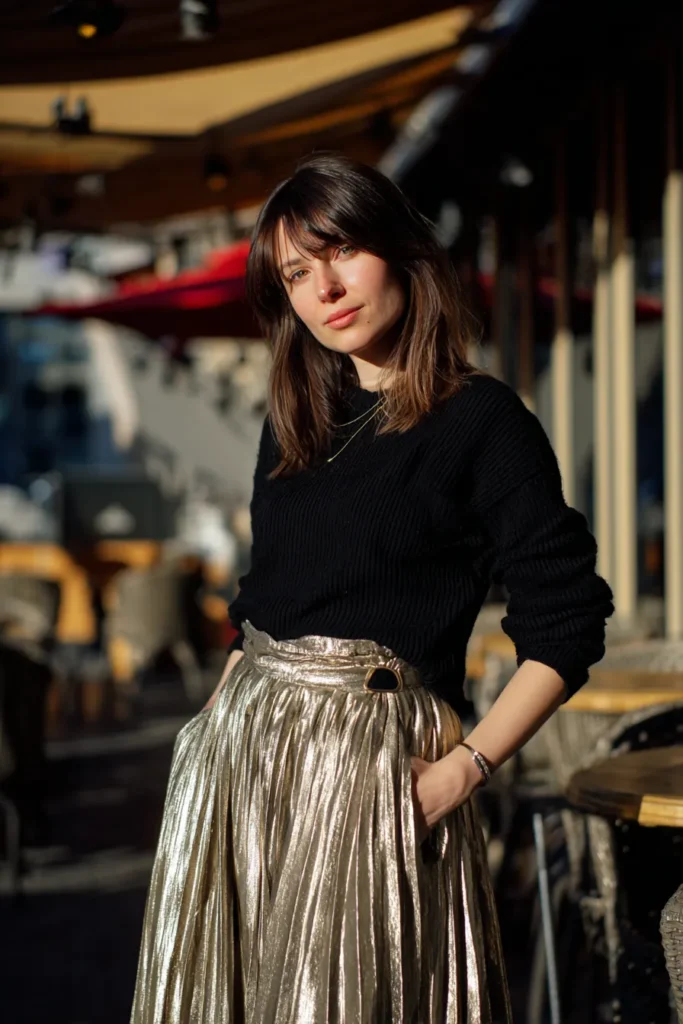 I love how easy this combo is to wear. The sweater keeps things comfortable and cozy while the pleated metallic skirt brings all the New Year’s sparkle without feeling too bold. I also feel like this silhouette is flattering on so many body types because it balances volume with structure. This is the look I reach for when I want to feel festive during the day and still keep things soft and chic.