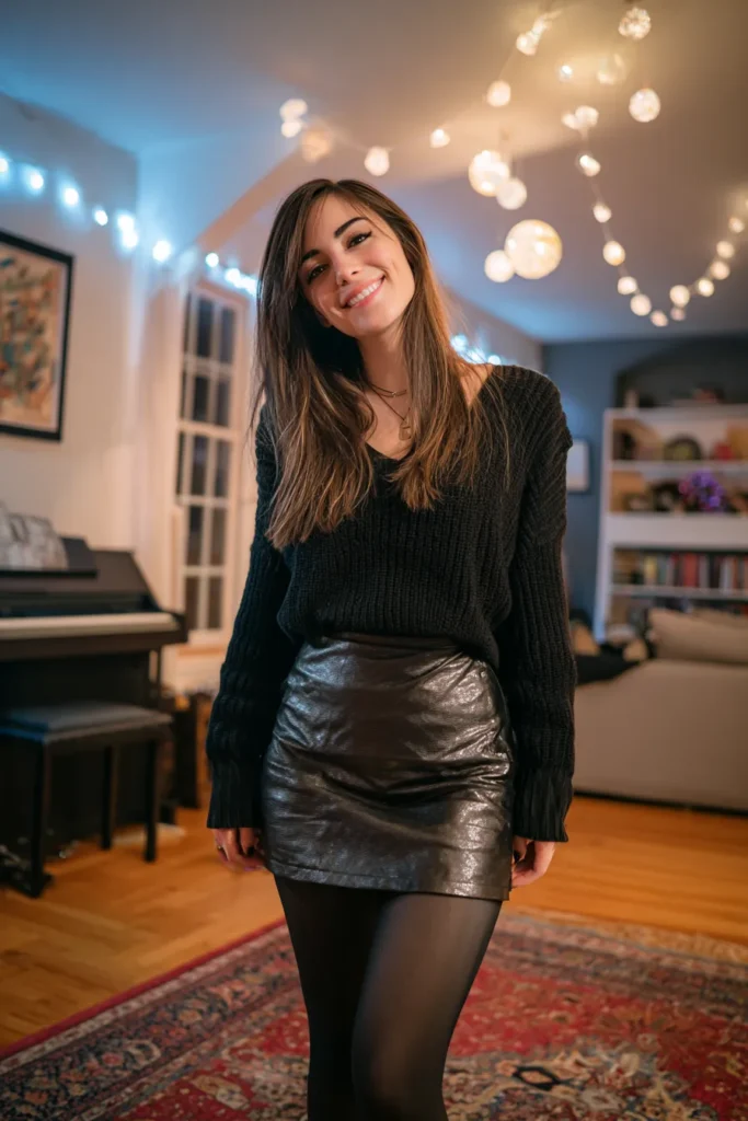 This look pairs a cozy black knit sweater with a metallic black mini skirt that brings just the right amount of shine. The skirt has a soft reflective finish that catches light in a subtle but stylish way while the sweater adds texture and warmth. Black tights keep the outfit sleek and cohesive and the simple jewelry adds a delicate touch without taking attention away from the metallic detail.