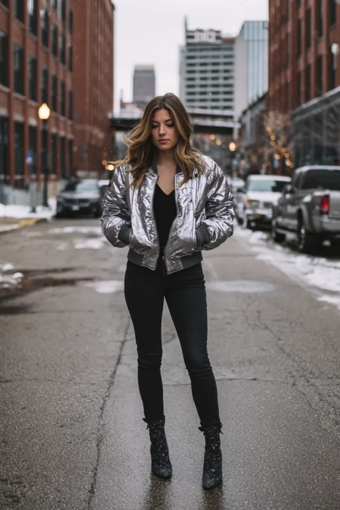 This look features a bold silver puffer jacket that instantly brings a metallic punch to a simple winter outfit. The jacket has a glossy finish that stands out against the black V neck top and fitted black jeans. The dark sparkly ankle boots tie everything together with a fun touch that hints at New Year’s sparkle. The overall vibe feels modern and laid back with just enough shine to make the outfit feel special.